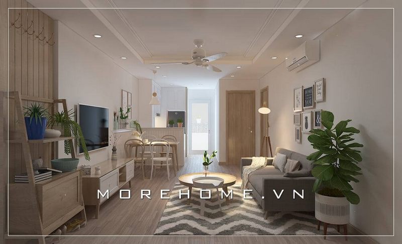Bạn có thể tạo một không gian nhẹ nhàng, gần gũi từ chất liệu gỗ ốp tường, kệ tivi kết hợp cùng đồ nội thất hiện đại để tạo vẻ đẹp độc đáo cho không gian phòng khách chung cư.
