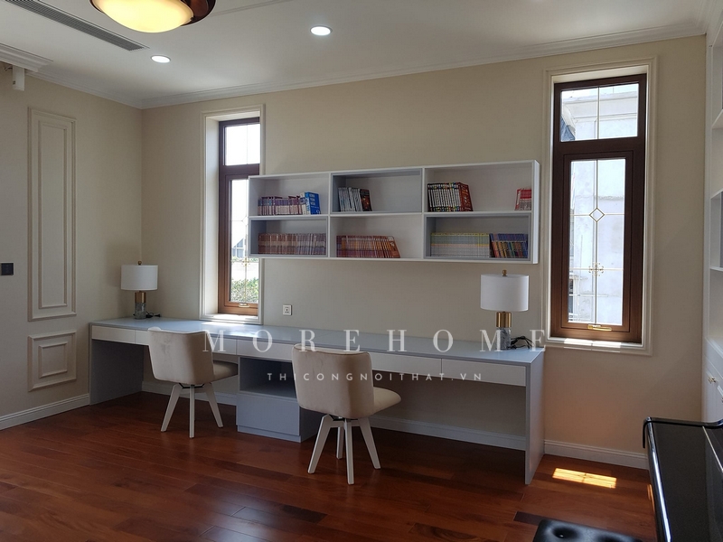 Thi công nội thất phòng khách đẹp với kệ tivi gỗ hiện đại cao cấp tại biệt thự Vinhomes Riverside Long Biên Hà Nội